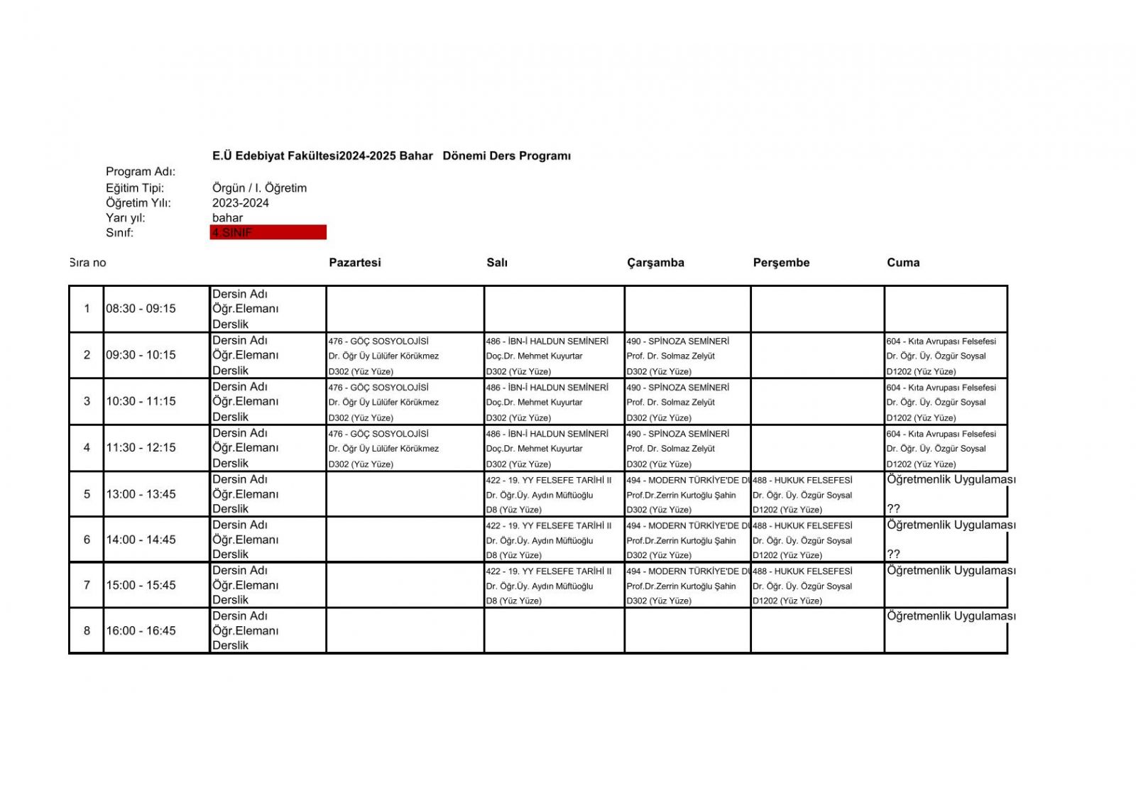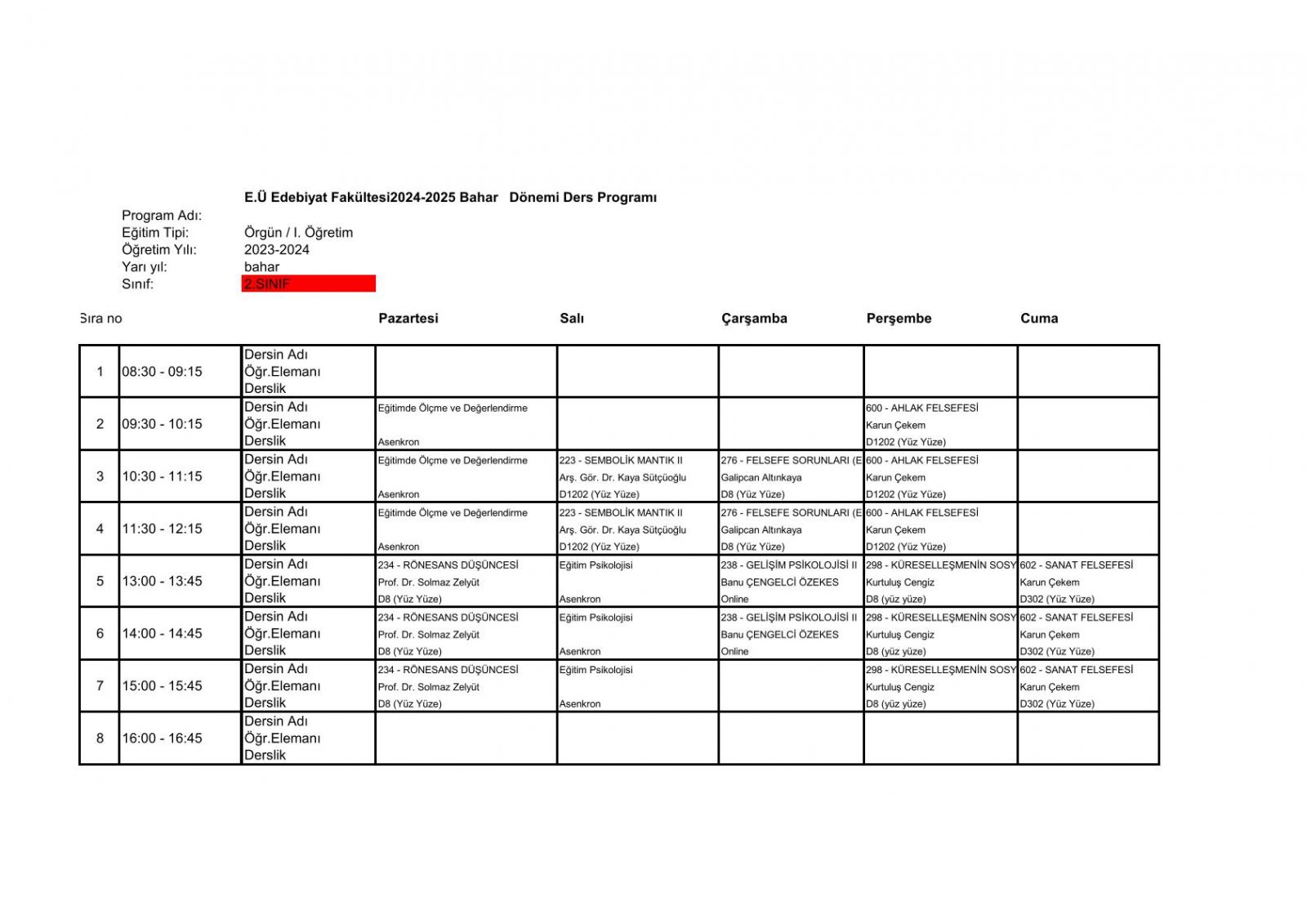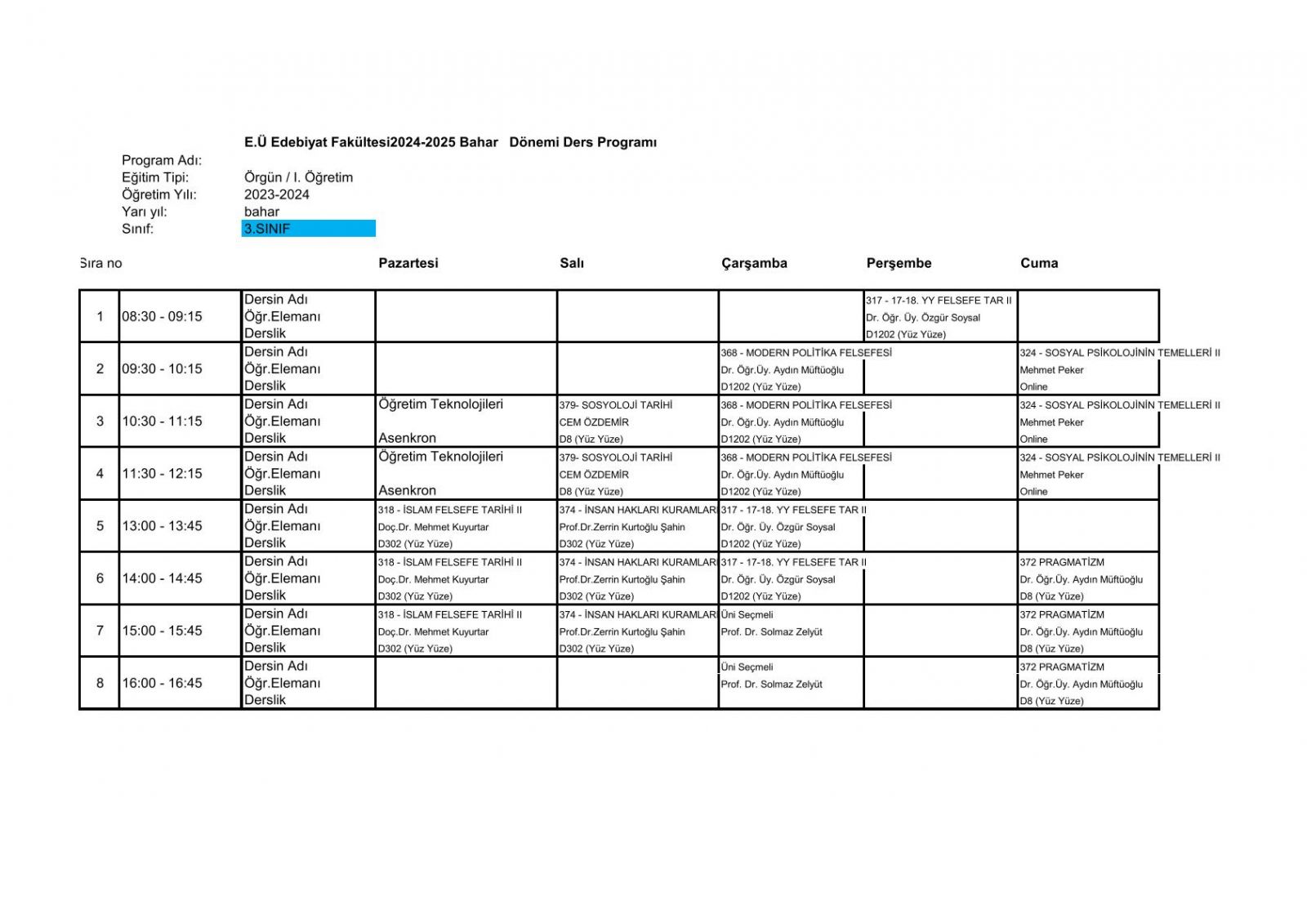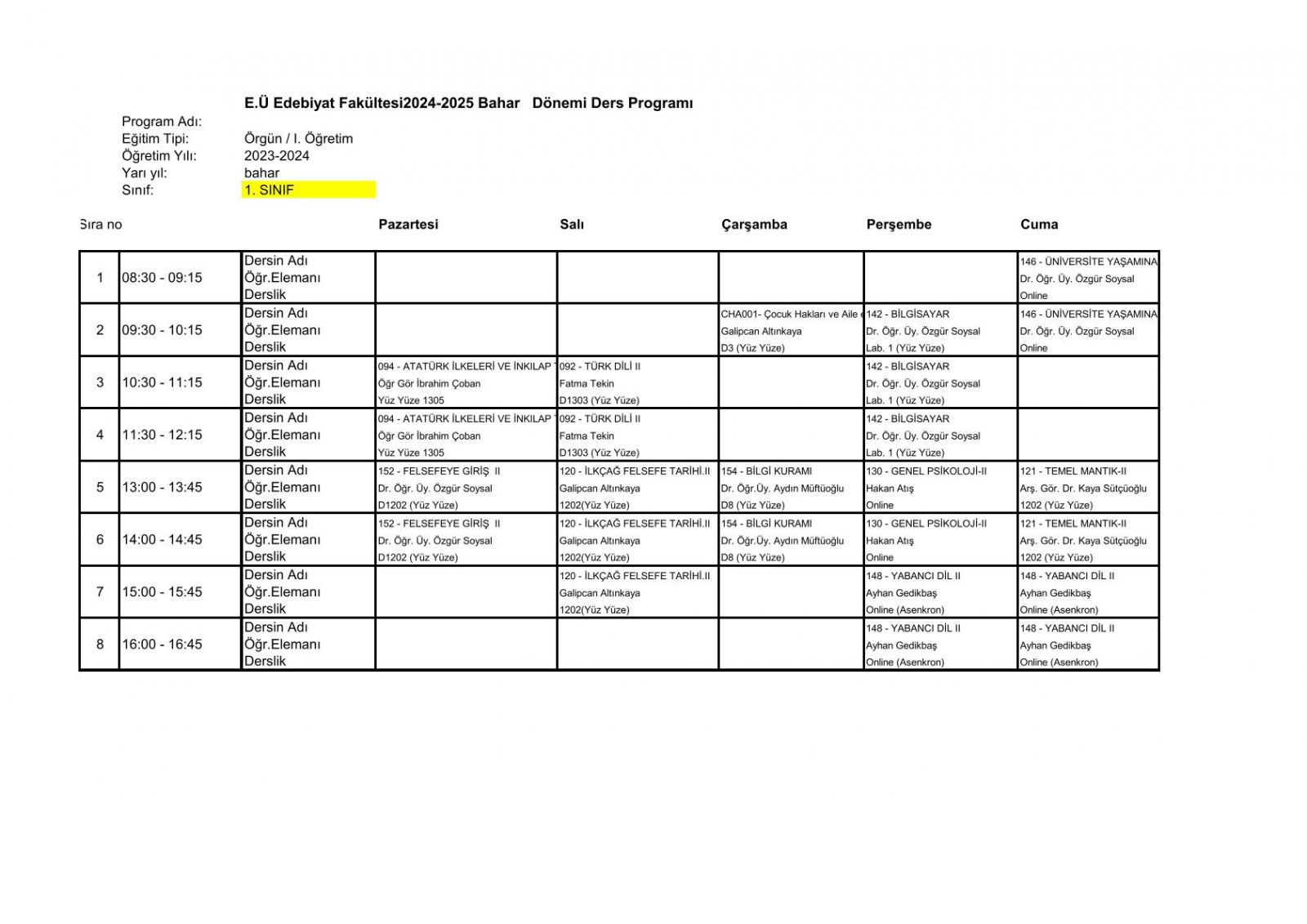 2025-6 Bahar Dönemi Ders Programı